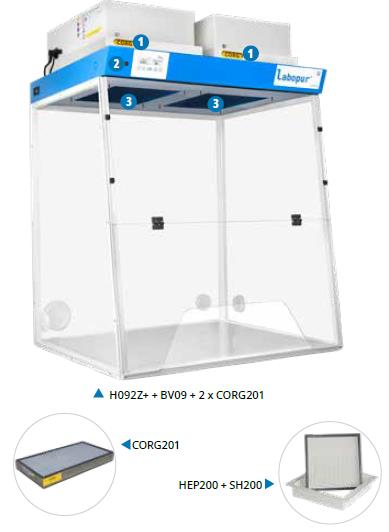 • Deux filtres HEPA H14 avec 99,999% d’efficacité pour des particules de ≥ 0,3µm.